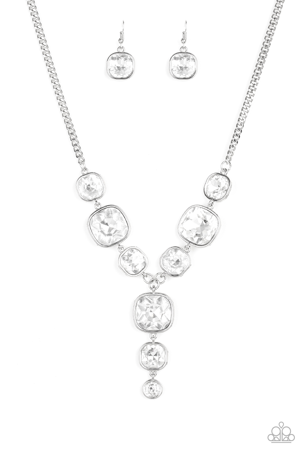 Featuring sleek silver frames, a dramatic collection of white gems cascade from the bottom thick silver chain. Additional gems trickle from the center, creating a glamorous extended pendant below the collar. Features an adjustable clasp closure.