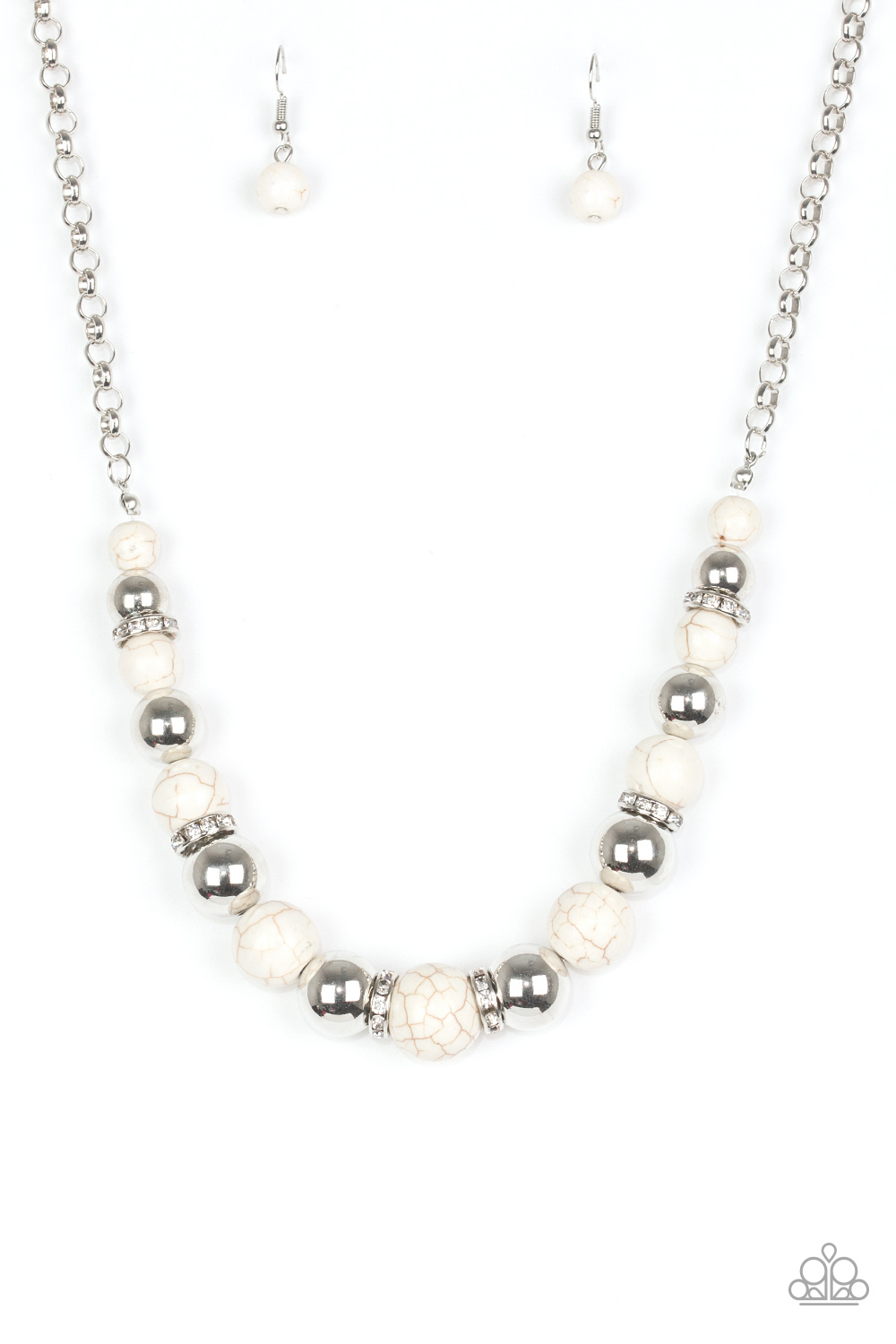 A collection of faux white stones, shiny silver beads, and white rhinestone encrusted rings join below the collar in a refined fashion. Features an adjustable clasp closure.