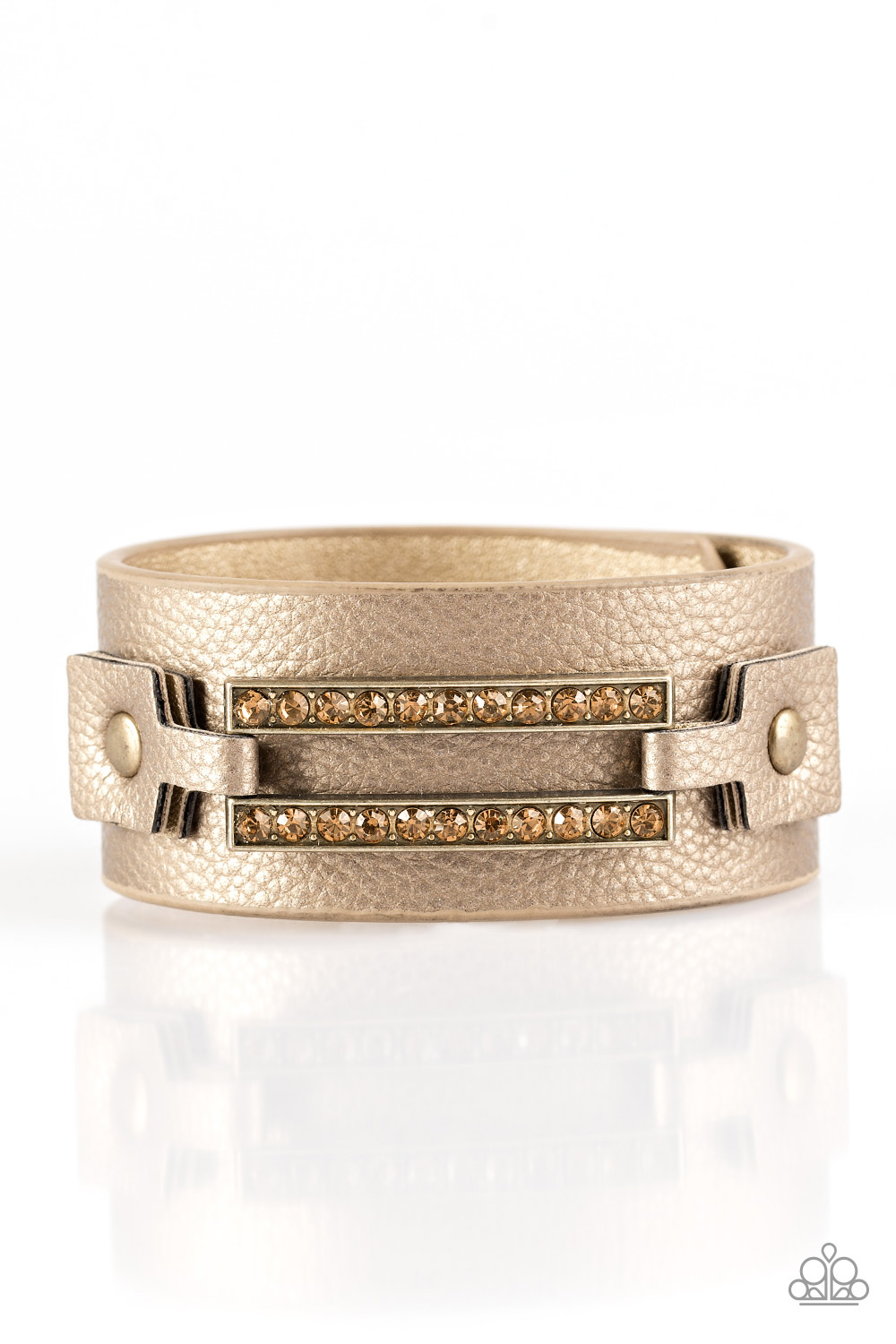 Encrusted in golden topaz rhinestones, a glistening brass frame is studded in place across the front of a metallic brown band for an edgy look. Features an adjustable snap closure.