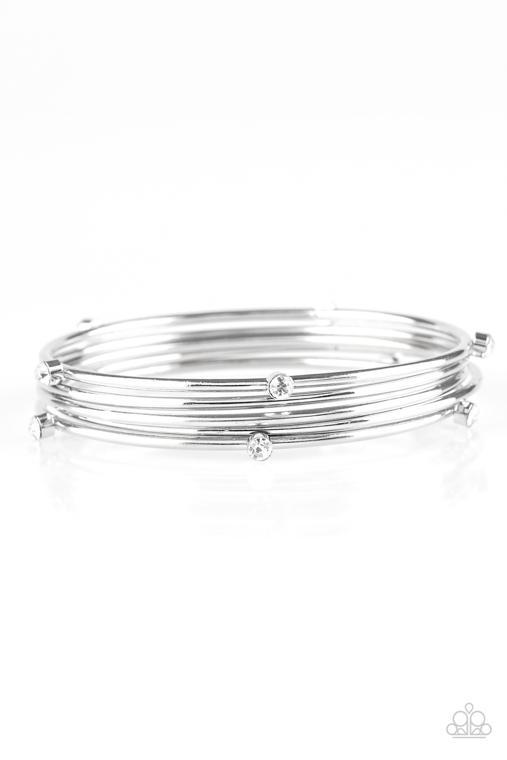Three shiny silver and two white rhinestone encrusted bangles stack across the wrist for a refined look.