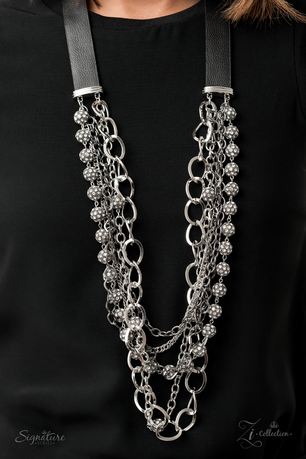 Attached to two strips of black leather, strands of bedazzled white rhinestone encrusted silver beads drape between an exaggerated display of mismatched silver and gunmetal chains down the chest. With its edgy sparkle, grunge meets glamour in this heart-stopping statement-maker. Features an adjustable clasp closure.