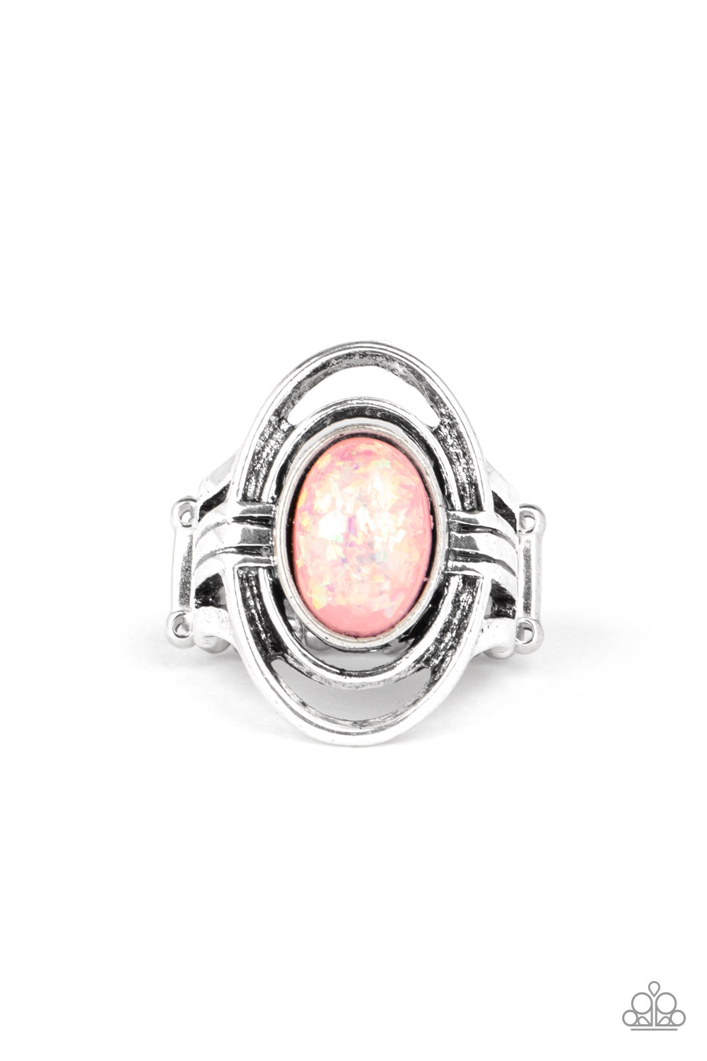 A sparkly pink opalescent bead is nestled between rippling silver ovals, creating an ethereal frame atop the finger. Features a stretchy band for a flexible fit.