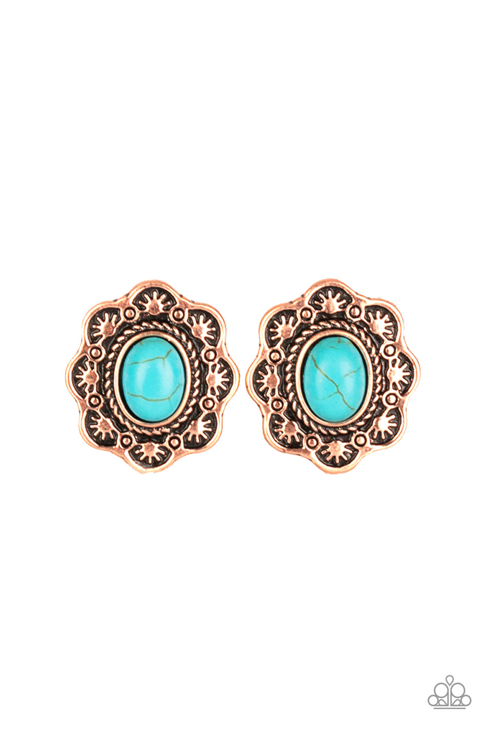 A refreshing turquoise stone is pressed into a copper floral frame radiating with sunburst patterns for a rustic look. Earring attaches to a standard post fitting.