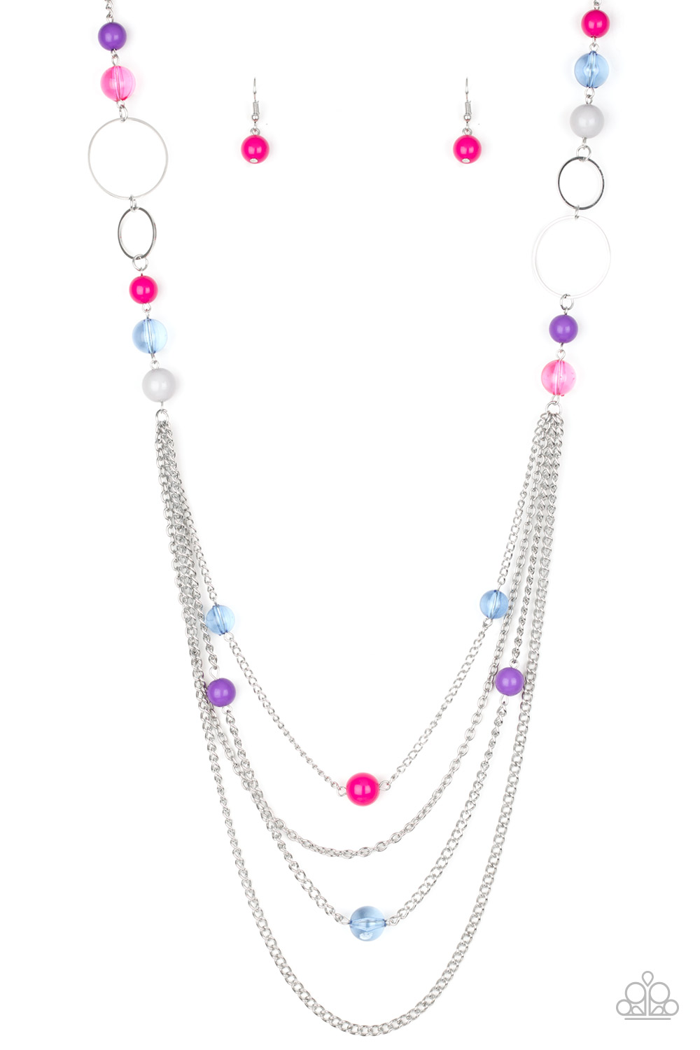 Infused with shimmery silver hoops, glassy and polished multicolored beads trickle along glistening silver chains for a bubbly look. Features an adjustable clasp closure.