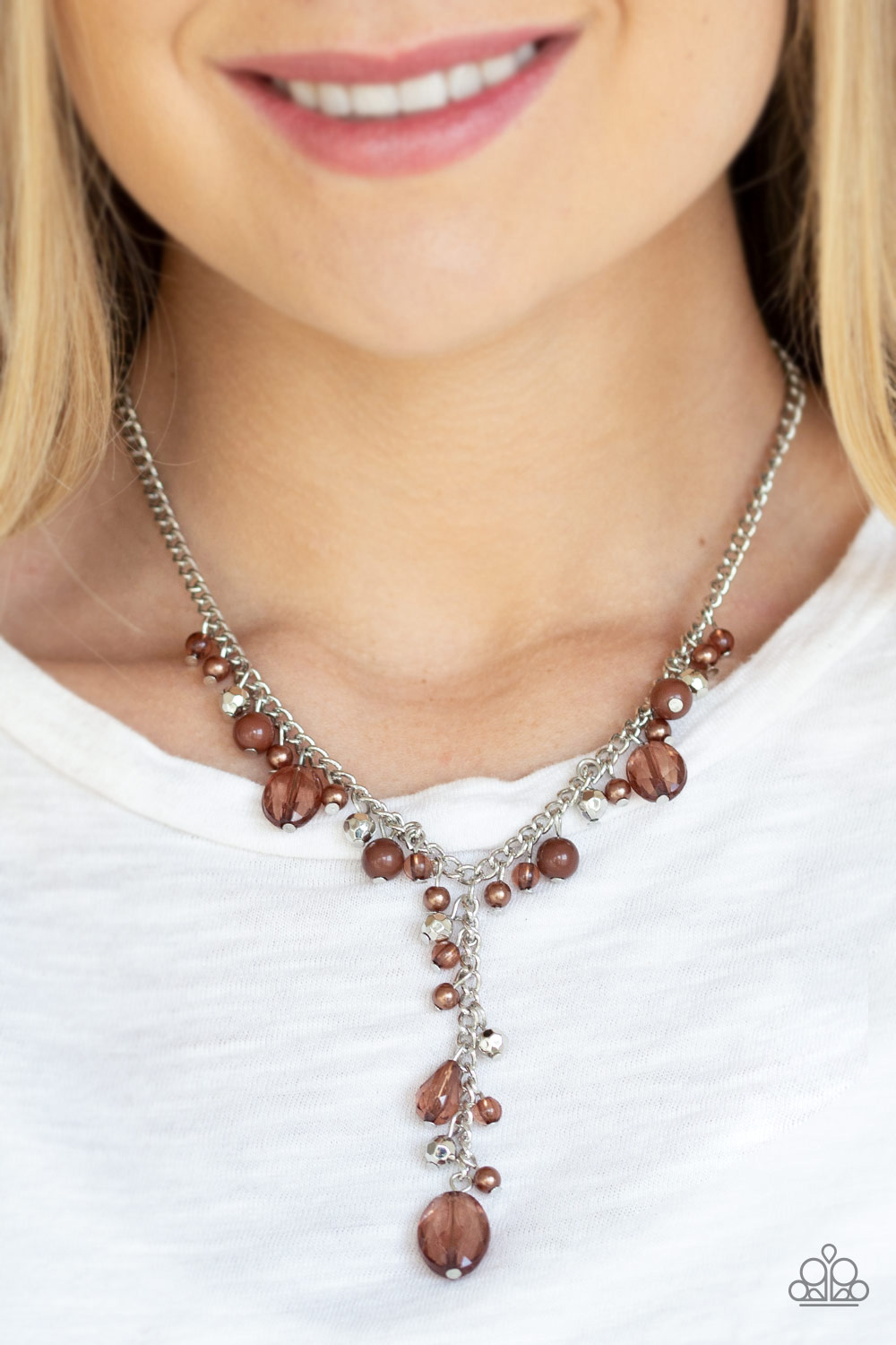 Mismatched polished brown beads, crystal-like beads, and faceted silver beads dance along a shimmery silver chain. Matching beading trickles along a single silver chain, creating a romantic extended pendant below the collar. Features an adjustable clasp closure.