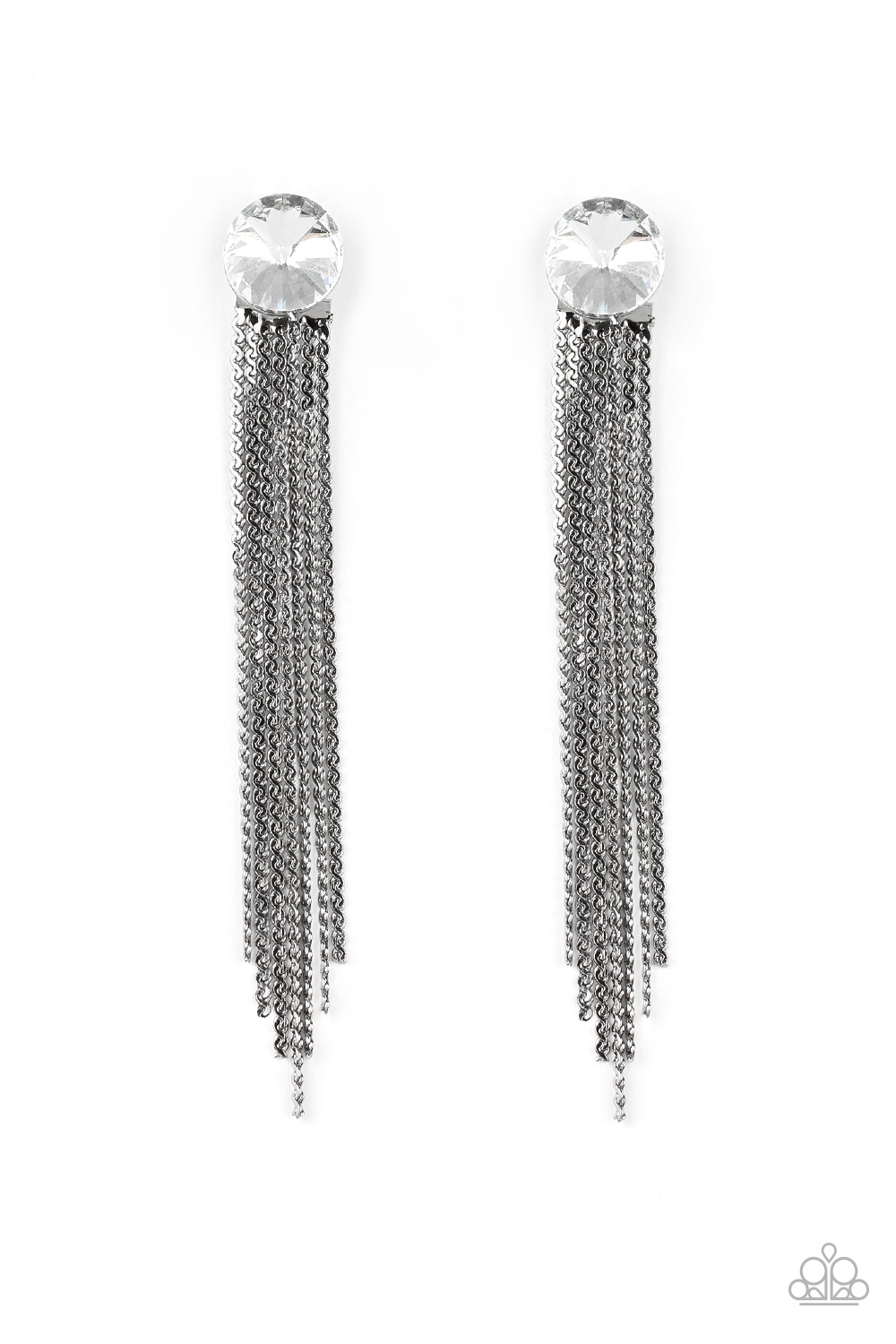 Flat gunmetal chains stream from the bottom of a solitaire white gem, creating a dramatically tapered fringe. Earring attaches to a standard post fitting.