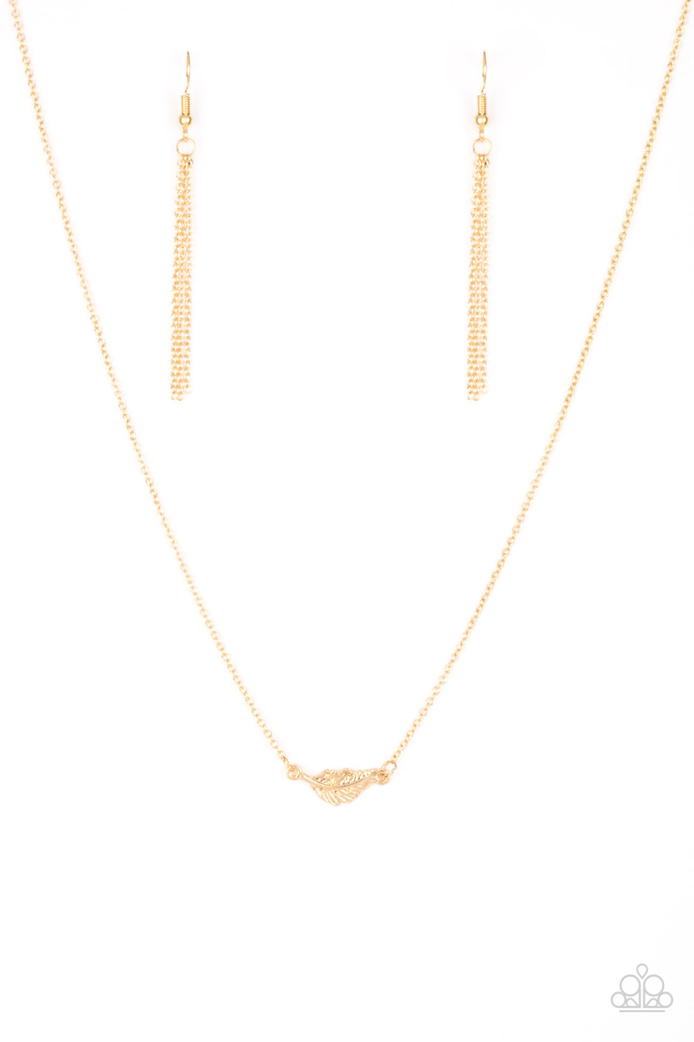 Featuring life-like textures, a dainty gold feather frame attaches to two dainty gold chains, creating a stationary pendant below the collar. Features an adjustable clasp closure.