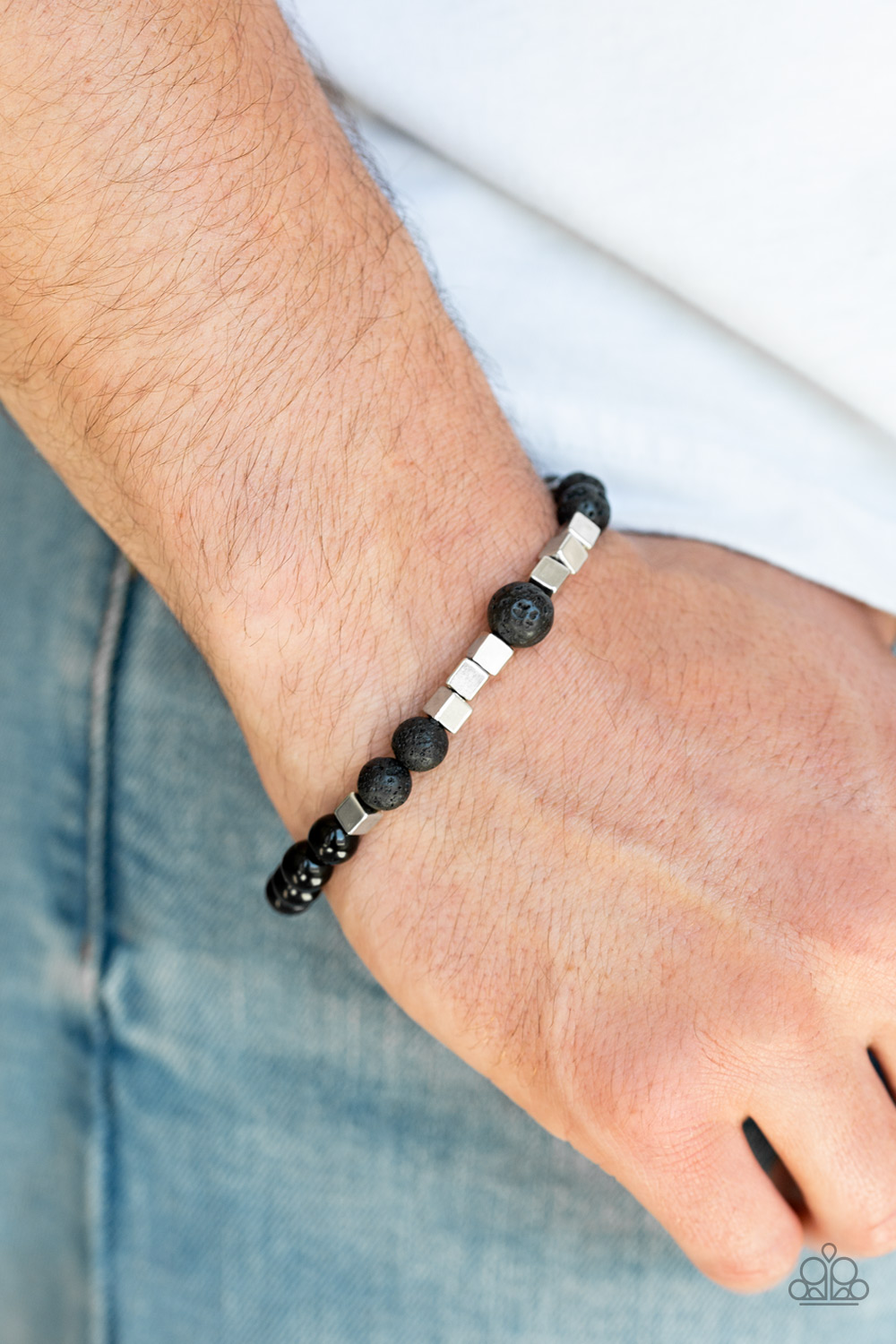 A collection of glassy black beads, earthy lava rock beads, and shimmery silver cubes are threaded along a stretchy band around the wrist for a seasonal flair.