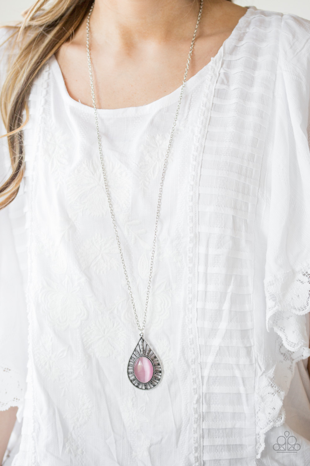A glowing pink moonstone is pressed into an ornate teardrop frame radiating with floral detail. The dramatic pendant swings from the bottom of a lengthened silver chain for a whimsical finish. Features an adjustable clasp closure.