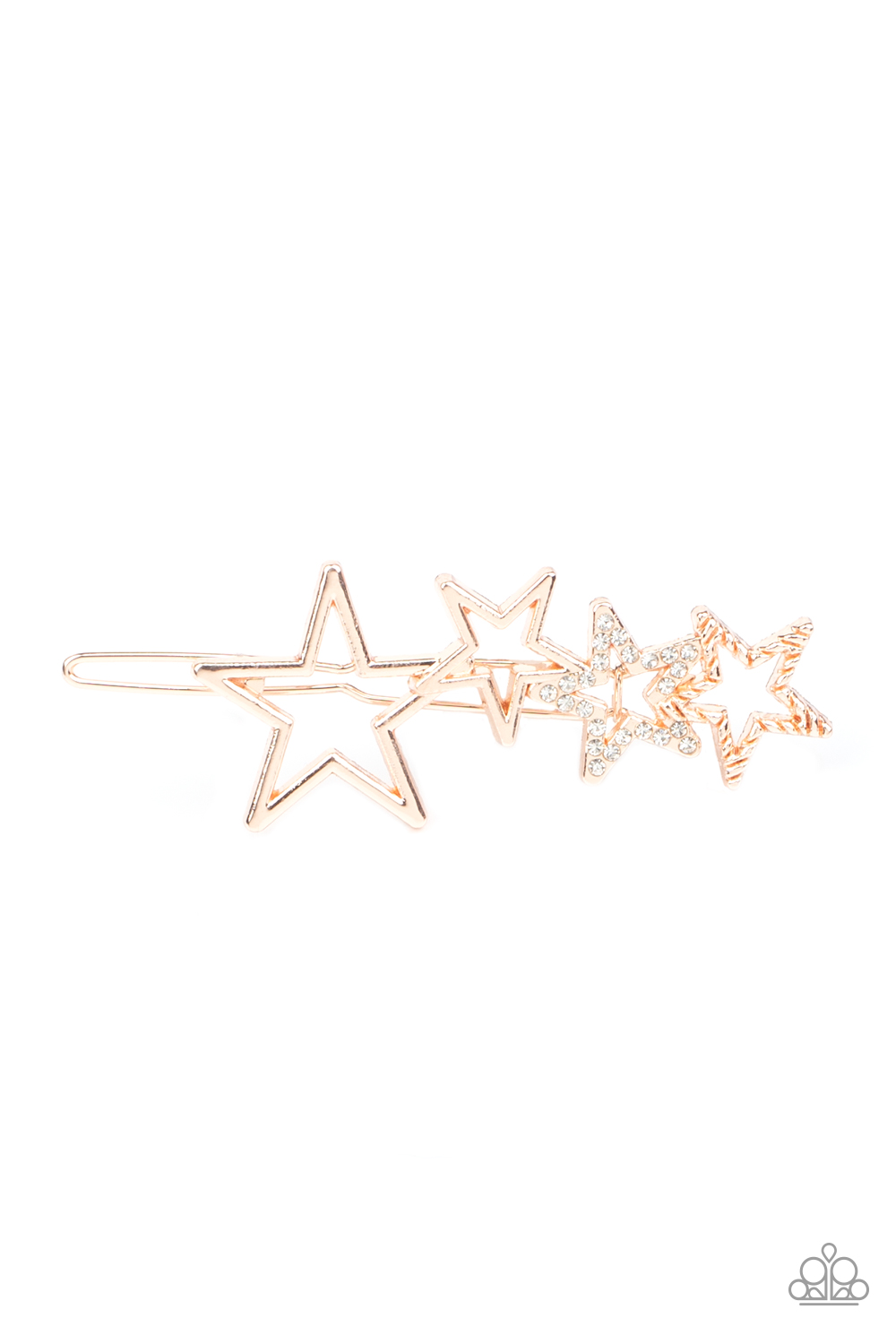 Featuring shiny, textured, and white rhinestone encrusted finishes, a collection of gold stars coalesce into a stellar frame. Features a clamp barrette closure.