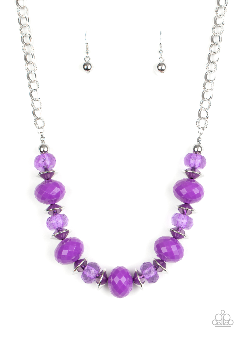 Saucer shaped silver beads trickle between faceted purple beads and crystal-like beads along an invisible wire, creating a glamorous display below the collar. Features an adjustable clasp closure.
