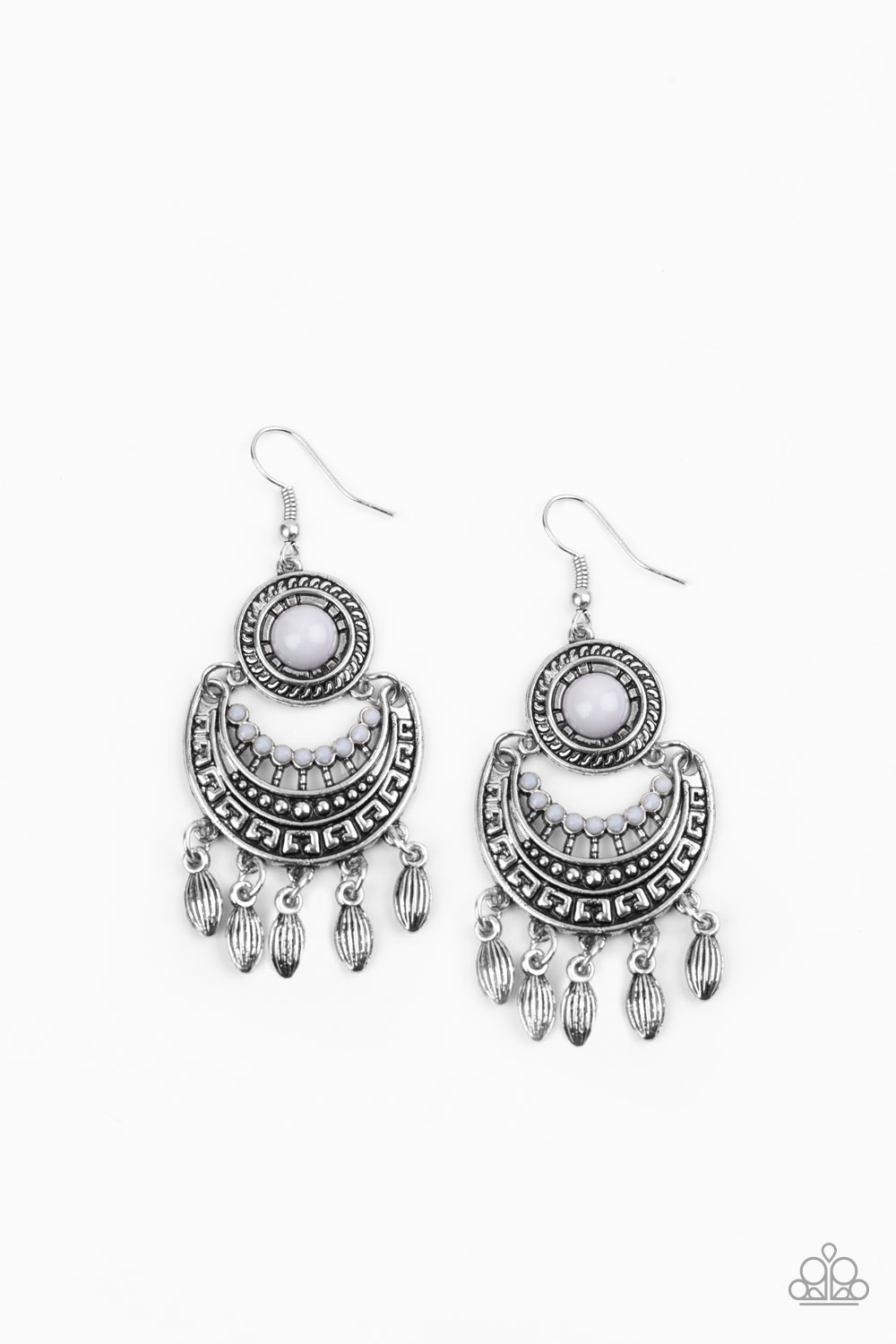 Dotted with a shiny gray beaded center, a round silver frame gives way to an ornate silver crescent. Dainty silver beads swing from the bottom of the stacked frames, adding a whimsical fringe to the tribal inspired lure. Earring attaches to a standard fishhook fitting.