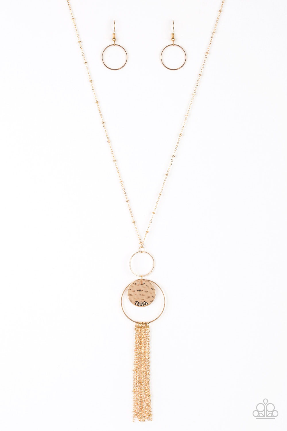 A delicately hammered gold disc is stamped in the inspirational word, "faith" and suspended from a double-hooped pendant at the bottom of an elongated gold satellite chain. A gold tassel swings from the bottom of the shimmery palette for a whimsical finish. Features an adjustable clasp closure.