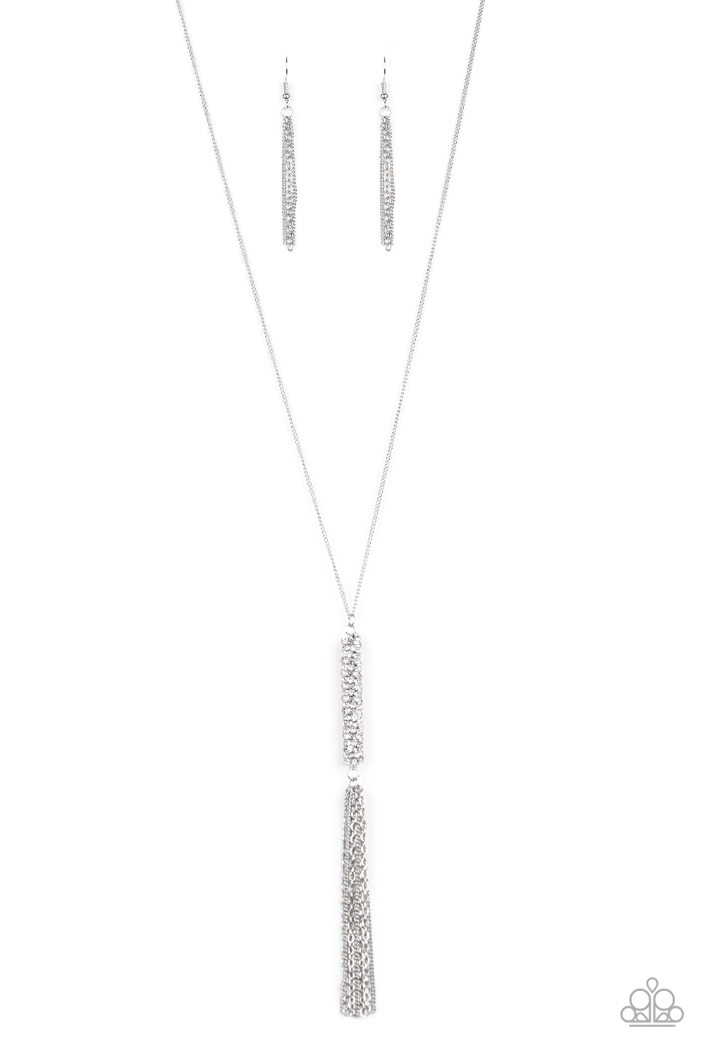 As if rolled in glitter, a chain of glassy white rhinestones spins tightly into a rounded silver pendant that swings from the bottom of a lengthened silver chain. A shimmery silver tassel dangles from the bottom of the sparkling pendant for a flirty finish. Features an adjustable clasp closure.