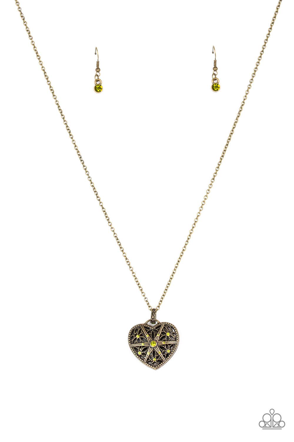 Encrusted in glittery green rhinestones, a vintage inspired heart pendant swings from the bottom of a shimmery brass chain for a romantic fashion. Features an adjustable clasp closure.