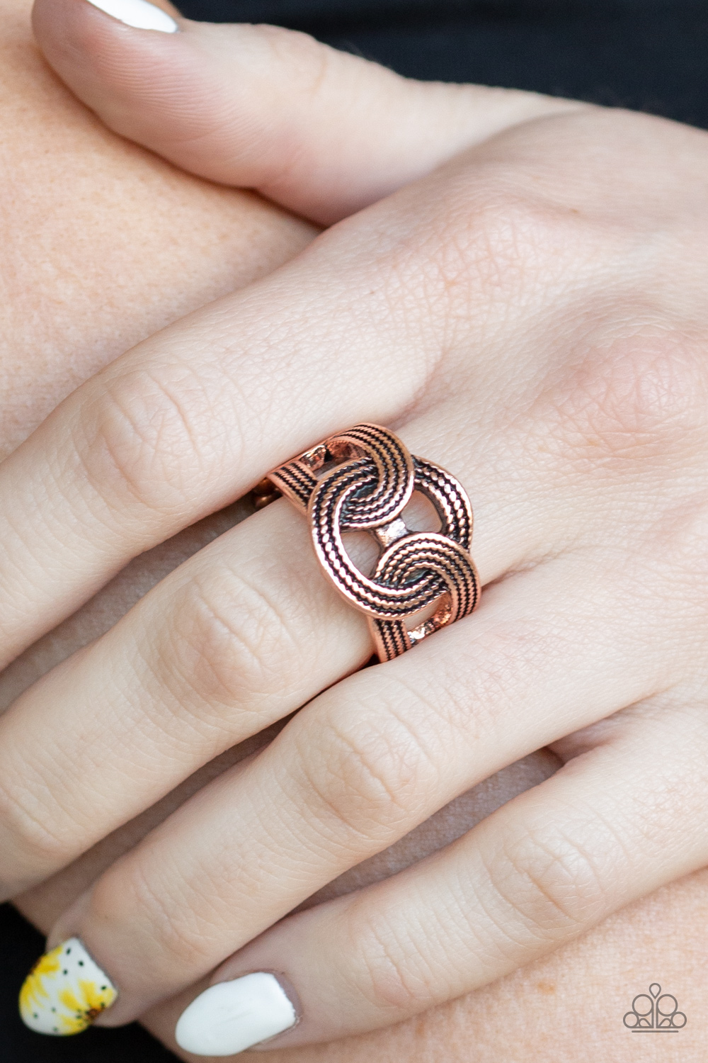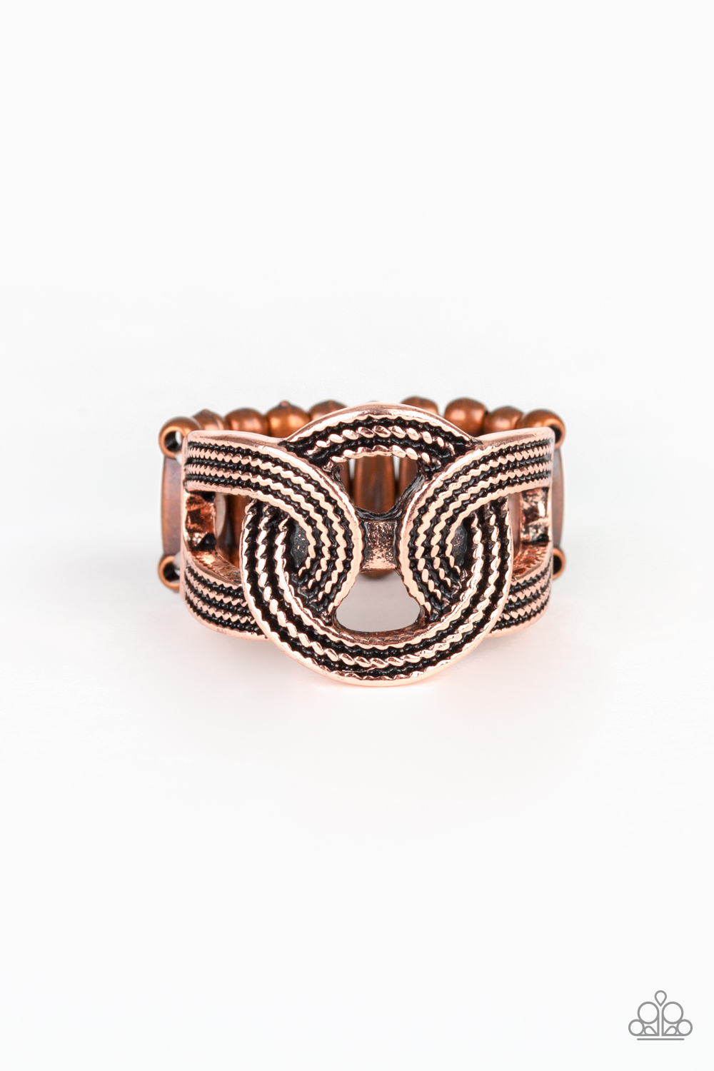 Stamped in linear patterns, glistening copper frames link across the finger for a casual look. Features a stretchy band for a flexible fit.