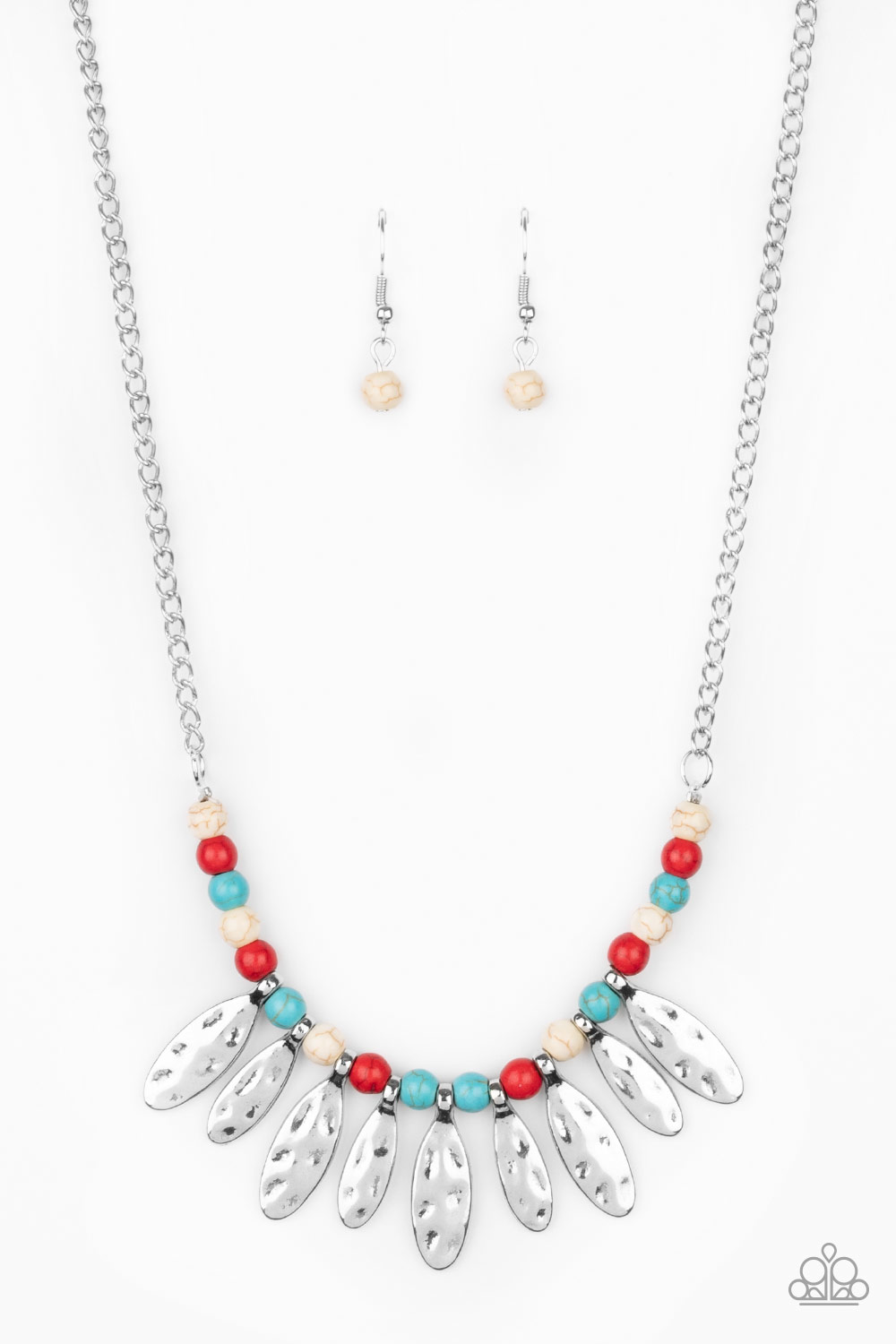 Infused with hammered silver frames, a colorful collection of dainty red, turquoise, and white stone beads are threaded along an invisible wire below the collar for an earthy flair. Features an adjustable clasp closure.