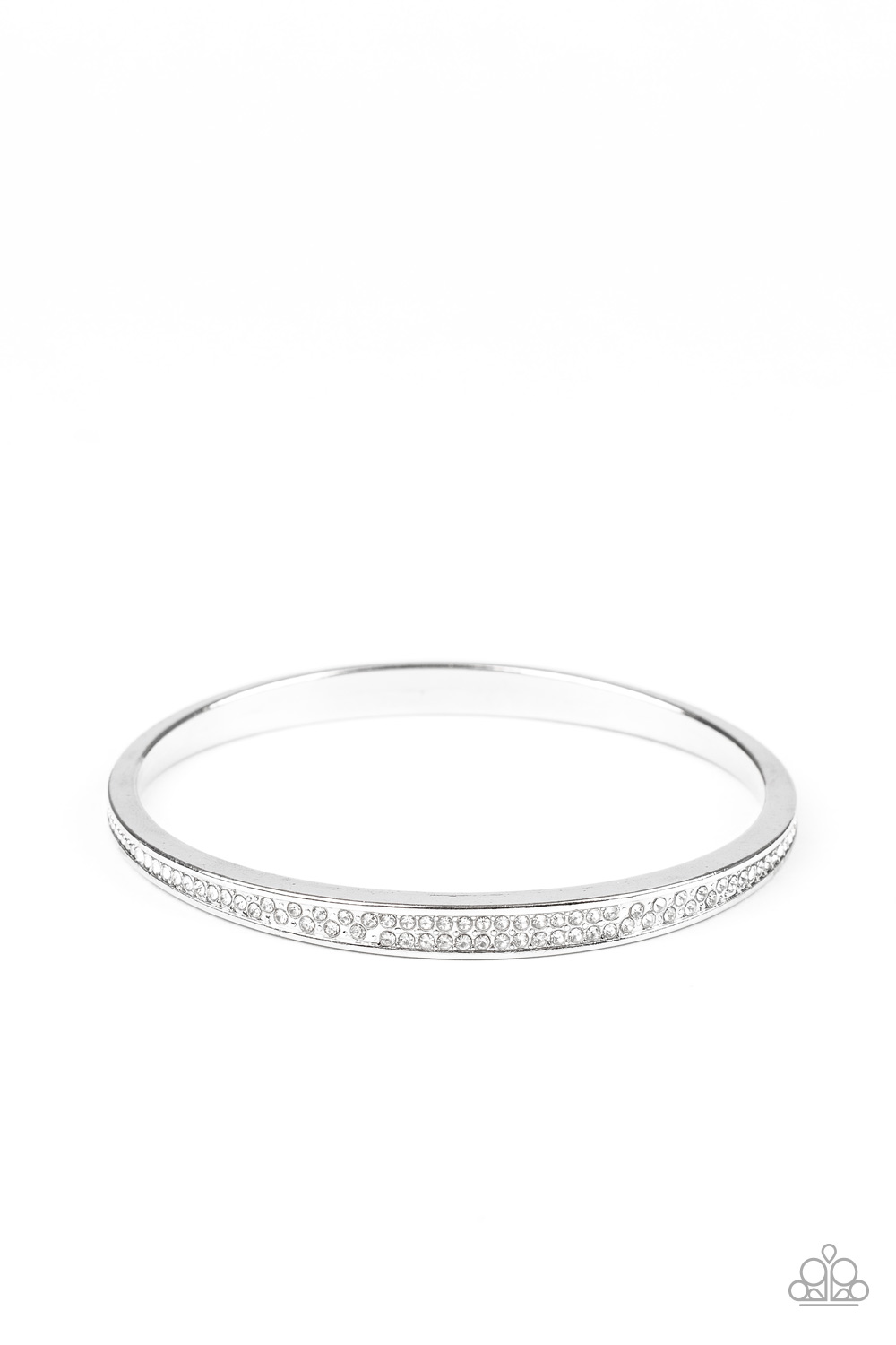 Rows of dainty white rhinestones have been encrusted along the front of a thick asymmetrical silver bangle for a timeless twist.