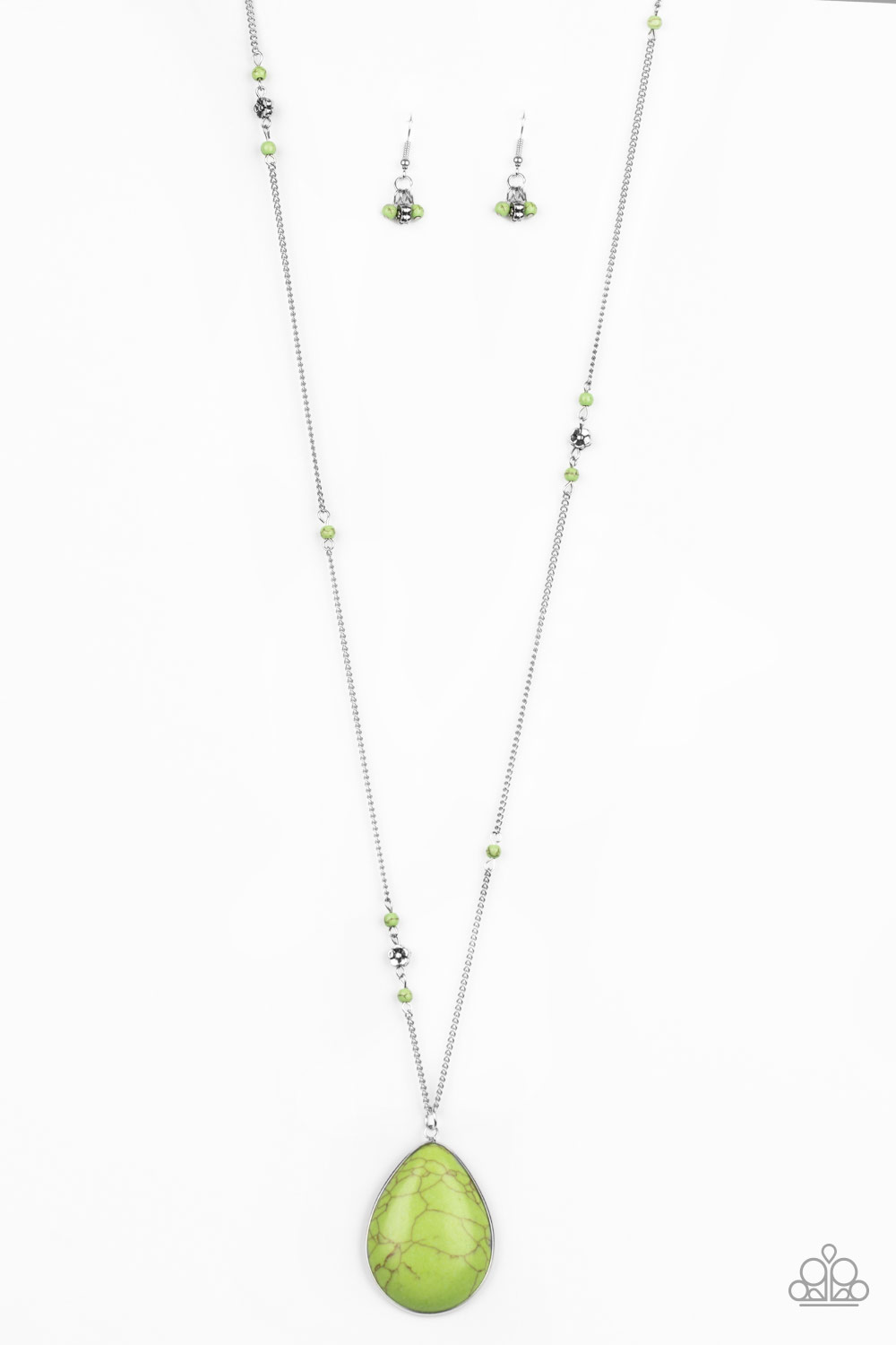 Dotted with dainty silver flowers and green stone beads, a shimmery silver chain gives way to an oversized green stone teardrop pendant for a whimsical look. Features an adjustable clasp closure.