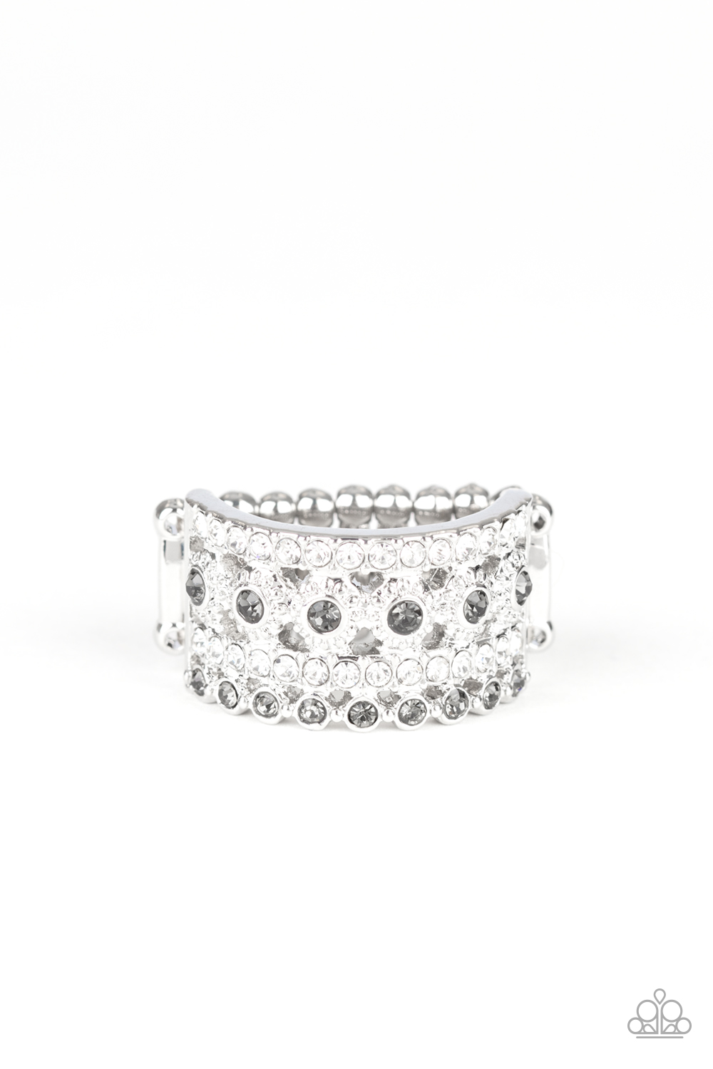 Mismatched bands of smoky and glassy white rhinestones layer across the finger, coalescing into a glitzy stacked band. Features a stretchy band for a flexible fit.