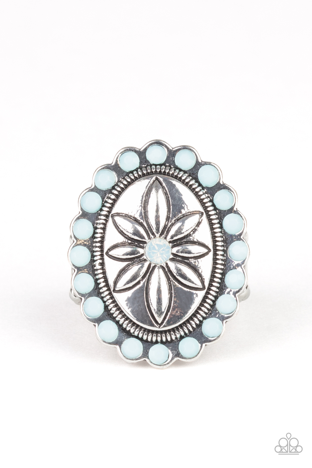 Featuring an opalescent rhinestone center, a stamped floral frame is bordered in a ring of dainty faceted blue beads for a whimsical fashion. Features a stretchy band for a flexible fit.