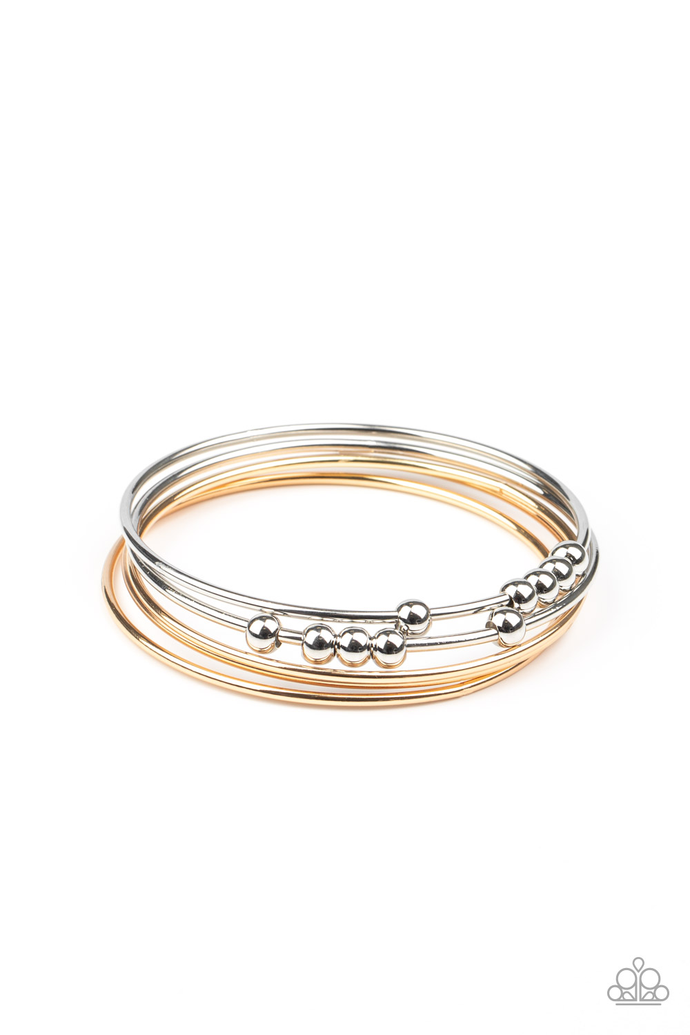 A shiny collection of plain and silver beaded gold and silver bangles slide up and down the wrist for a classically stacked look.