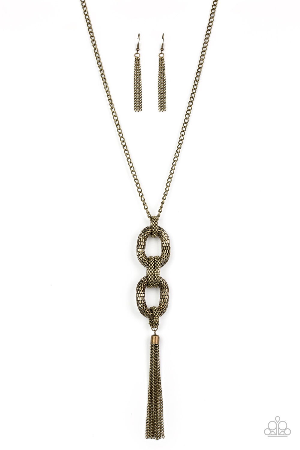 Brass box-chain links connect into a bold pendant at the bottom of a lengthened brass chain. An antiqued brass chain tassel swings from the bottom of the interconnected pendant for an edgy finish. Features an adjustable clasp closure.