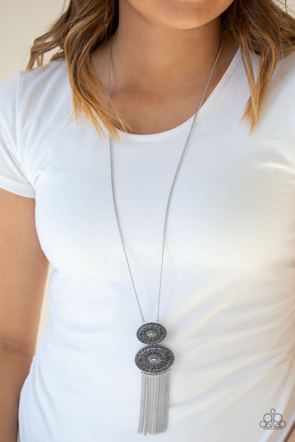 Embossed in radiant sunburst patterns, two oval silver frames connect at the bottom of a lengthened silver chain. Glistening silver chains stream from the bottom of the stacked pendant, adding a wanderlust flair to the tribal inspired look. Features an adjustable clasp closure.