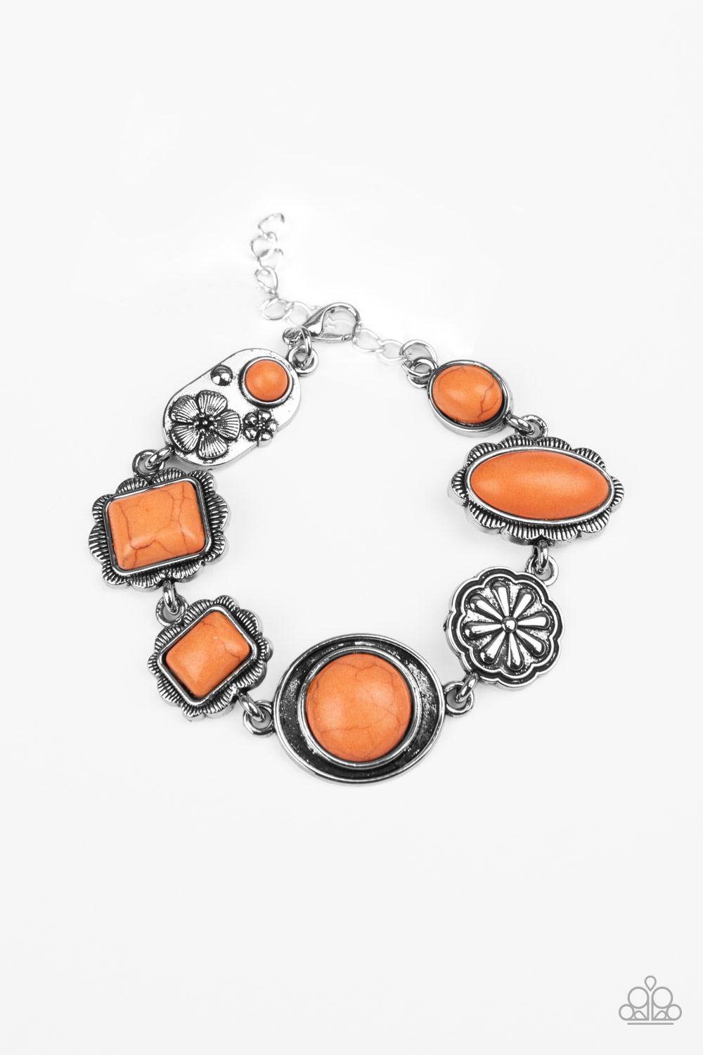 Featuring vivacious orange stone centers, a collection of antiqued silver frames link with a decorative floral charm around the wrist for a seasonal flair. Features an adjustable clasp closure.