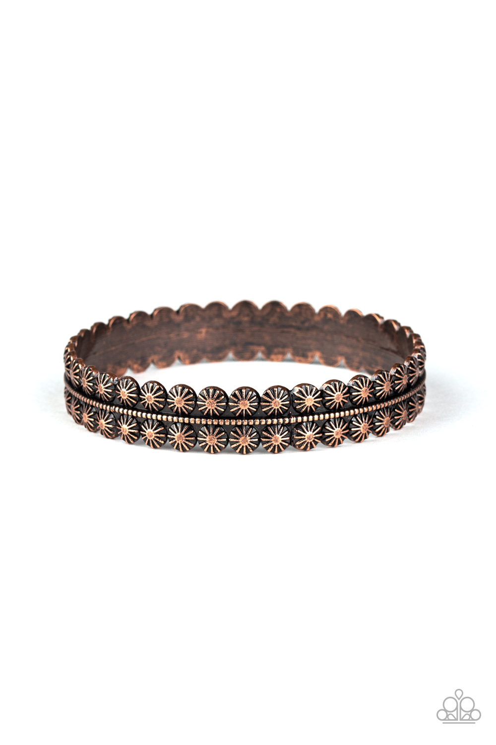 Brushed in an aged finish, an ornately studded copper bangle encircles the wrist as a gorgeous rustic accent.