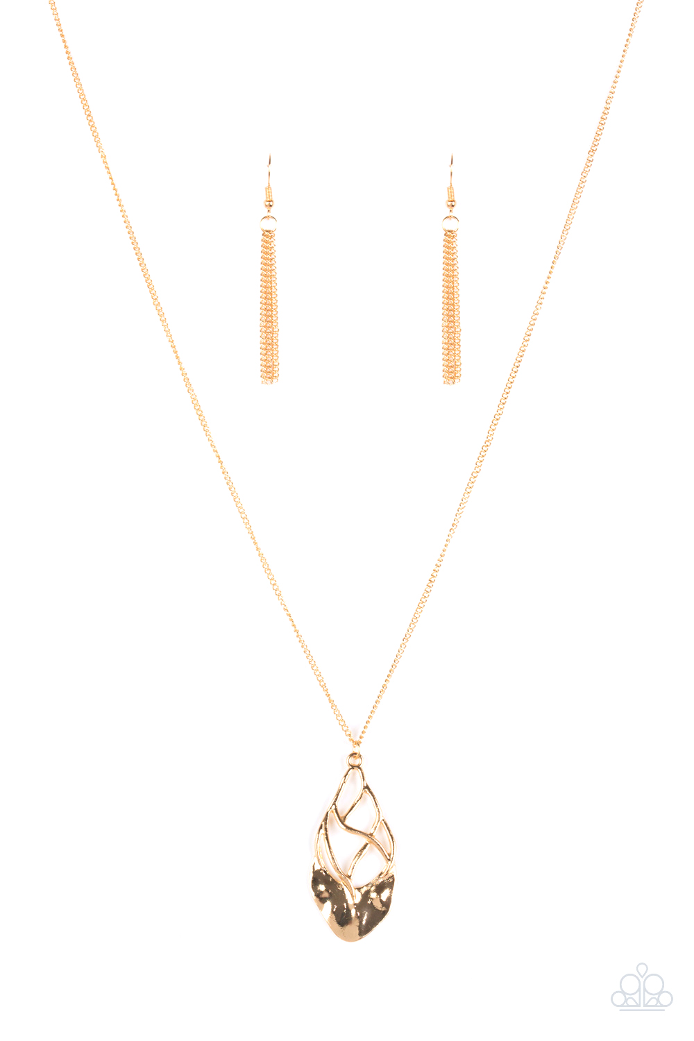 Swinging from the bottom of an elongated gold chain, twisting gold bars attach to a delicately hammered gold plate, coalescing into a refined pendant. Features an adjustable clasp closure.