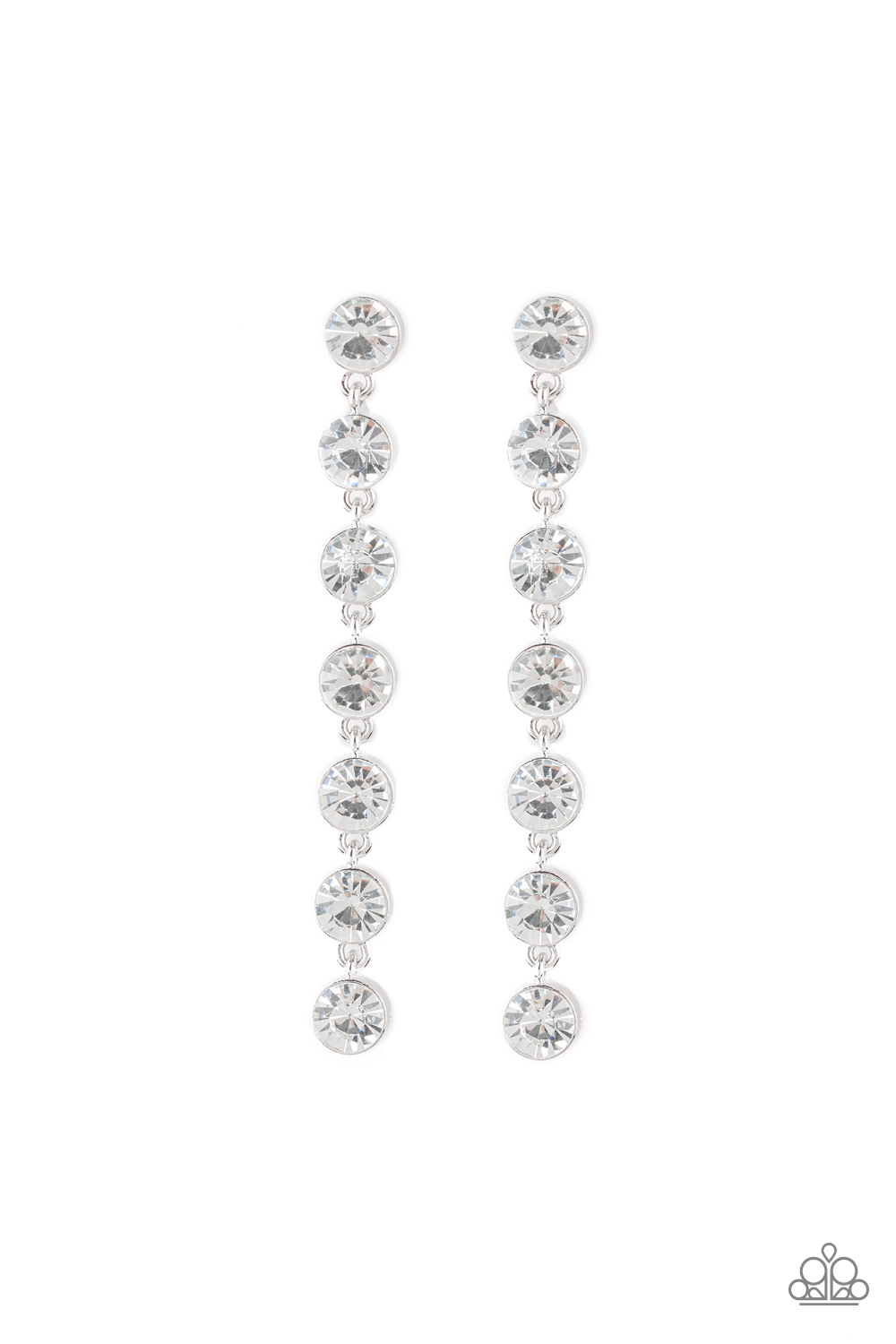 Featuring sleek silver fittings, a collection of oversized white rhinestones drip from the ear for a glamorous look. Earring attaches to a standard post fitting.