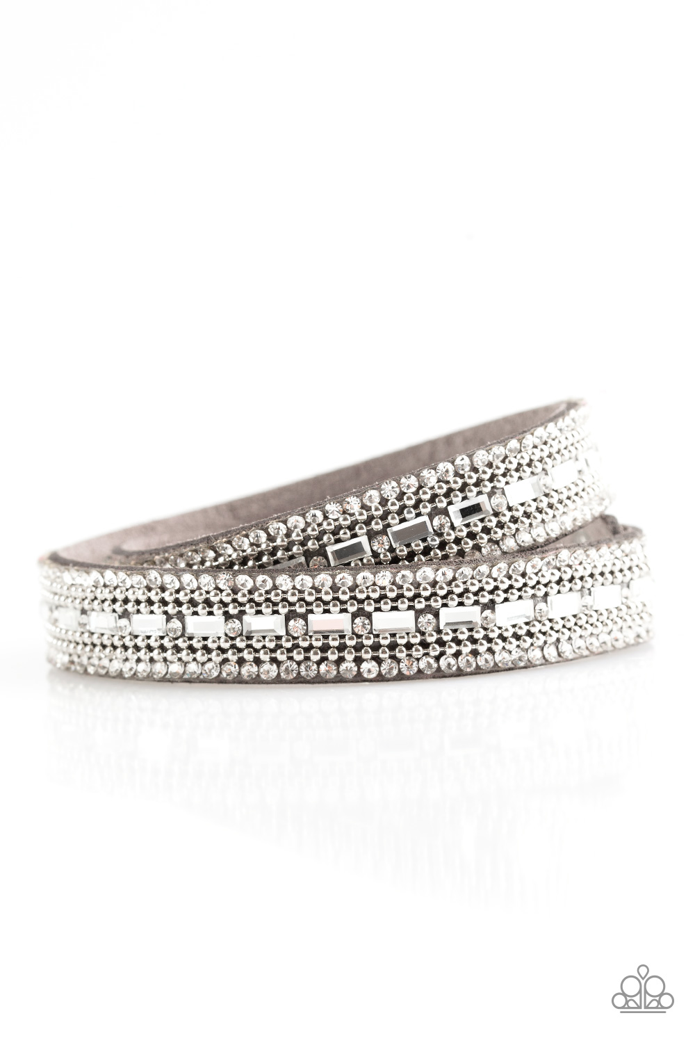 Featuring round and emerald style cuts, glassy white rhinestones are encrusted along a gray suede band. Rows of shimmery silver ball-chain are pressed into the glittery band for a sassy finish. The elongated band allows for a trendy double wrap design. Features an adjustable snap closure.