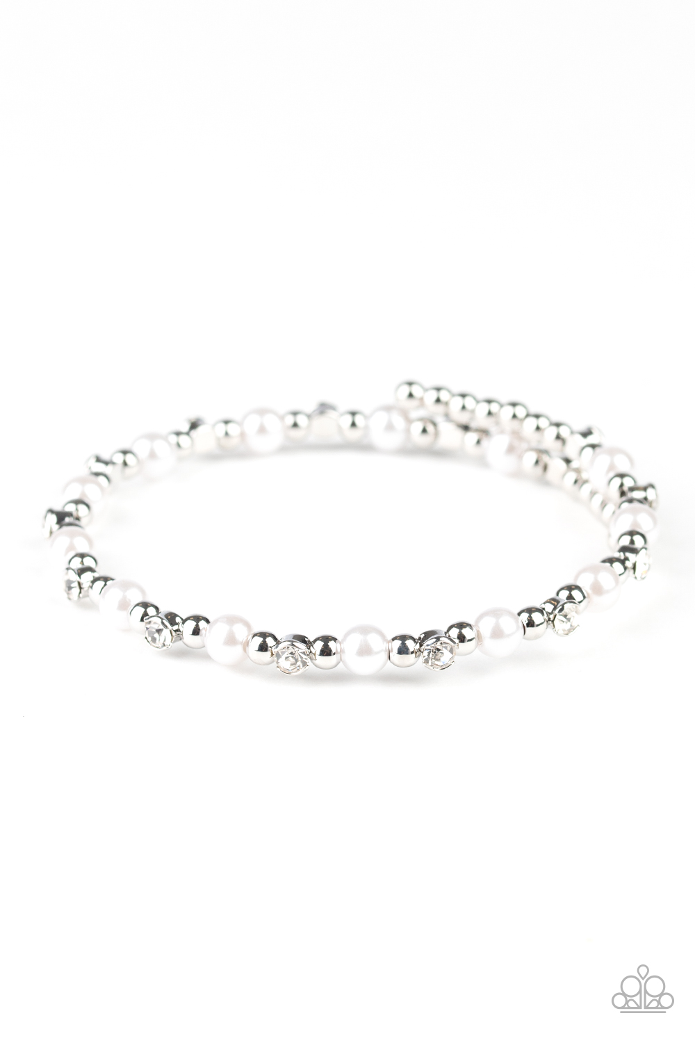 A collection of shiny beads, white pearls, and dainty white rhinestones are threaded along a dainty wire around the wrist for a timeless look.
