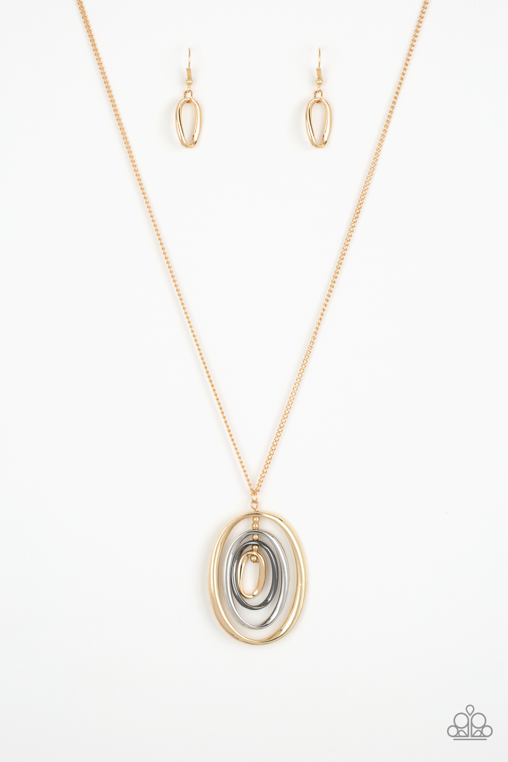 Threaded along a gold-beaded rod, mismatched gold, silver, and gunmetal ovals ripple into a dizzying pendant at the bottom of a lengthened gold chain. Features an adjustable clasp closure.