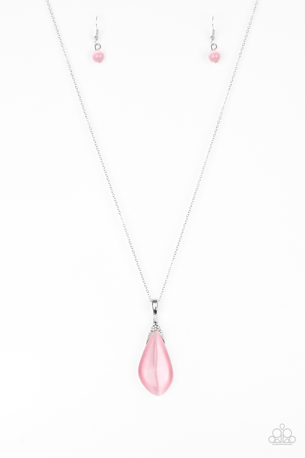 Infused with a white rhinestone encrusted fitting, an asymmetrical pink moonstone swings from the bottom of an elongated silver chain for a whimsical look. Features an adjustable clasp closure.