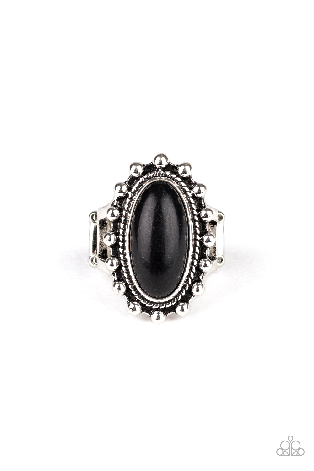 An oval black stone is pressed into the center of a studded silver frame, creating a rustic centerpiece atop the finger. Features a stretchy band for a flexible fit.