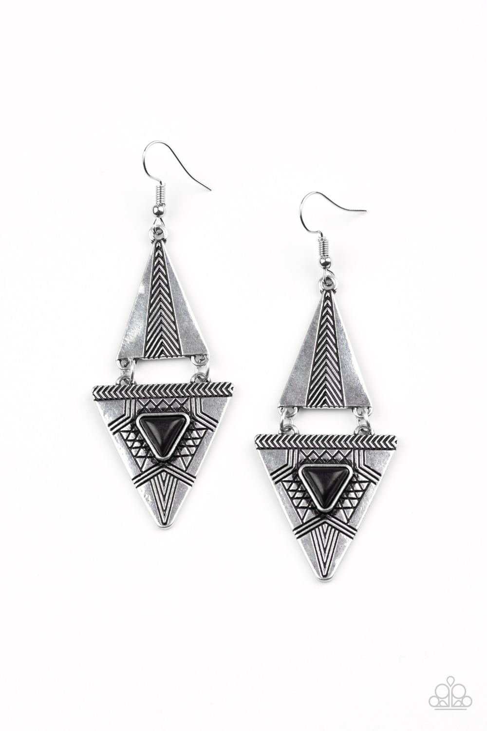 Stamped in tribal inspired patterns, two triangular frames connect into a bold lure. Chiseled into a matching triangle, an earthy black stone is pressed into the bottom frame for a seasonal finish. Earring attaches to a standard fishhook fitting.
