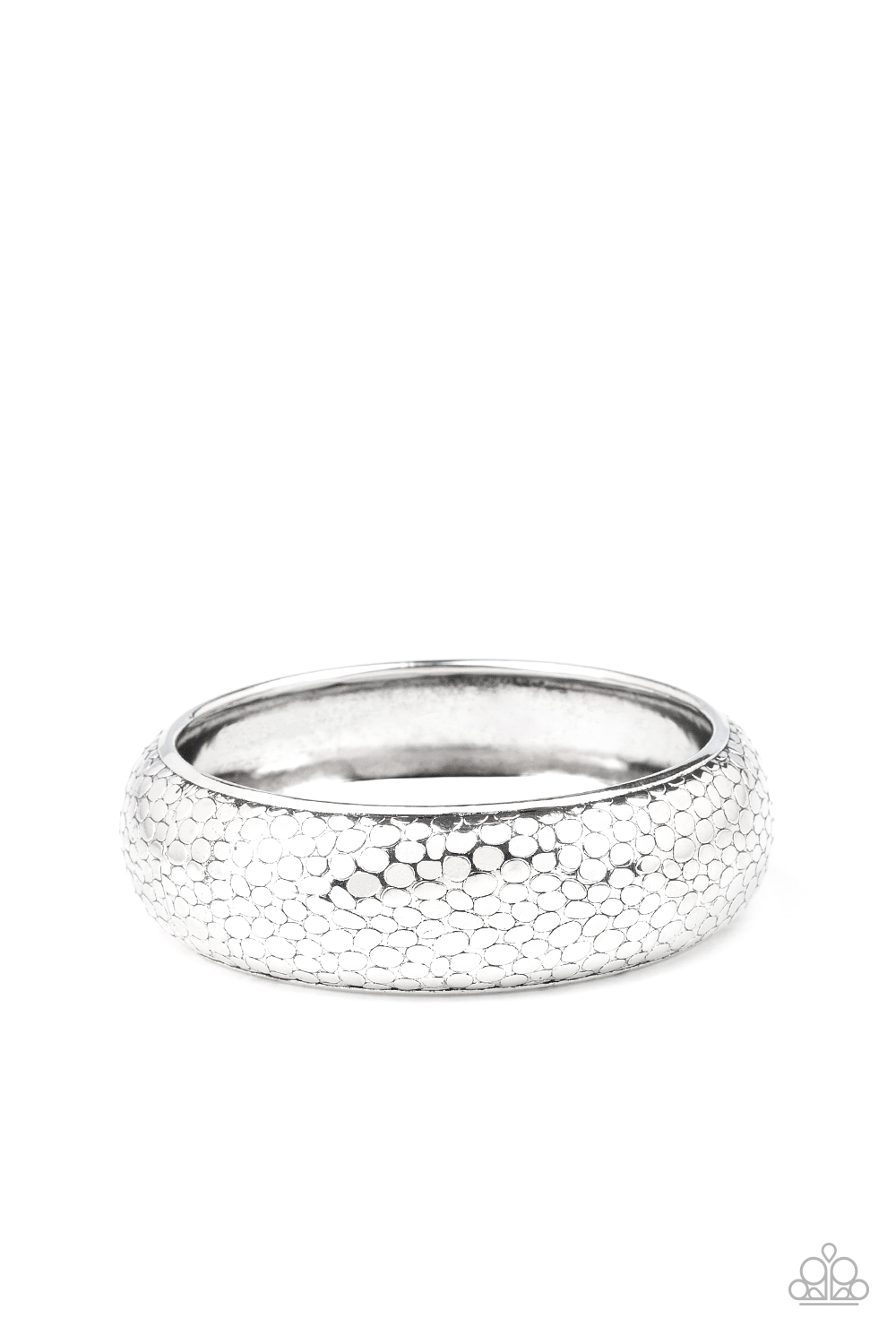 Featuring a metallic python-like pattern, a dramatically oversized silver bangle slides along the wrist for an edgy look.