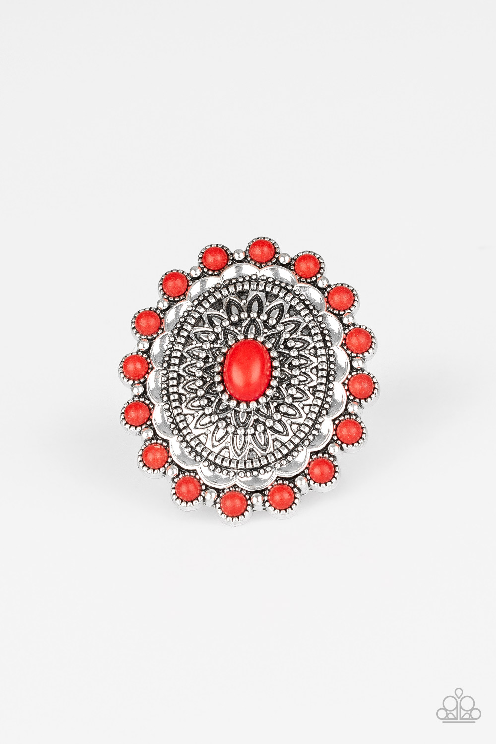 Embossed in dizzying floral details, a shimmery silver frame is dotted with fiery red stone accents for a seasonal look. Features a stretchy band for a flexible fit.