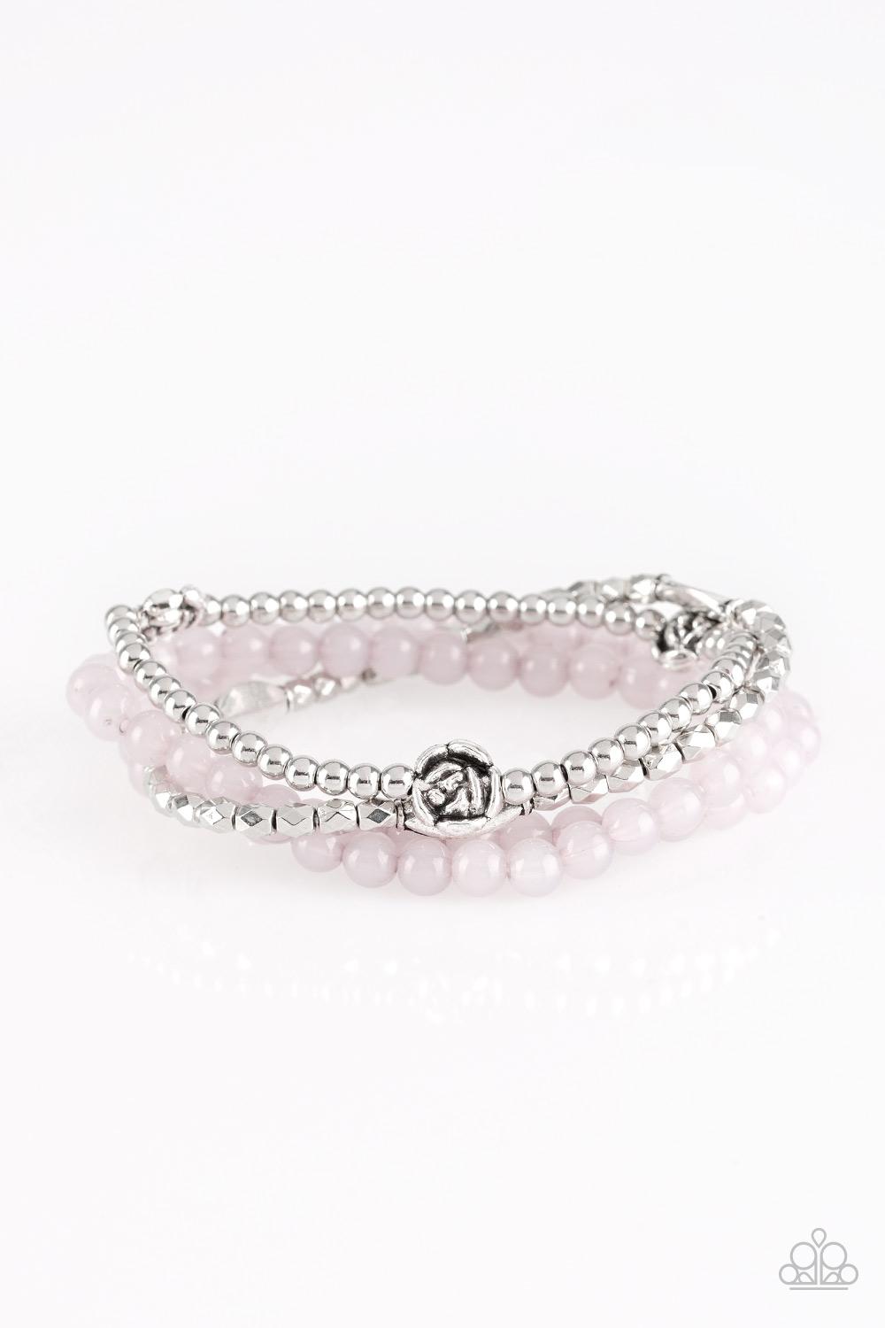 Mismatched silver beads and strands of glassy gray beads are threaded along stretchy bands. Infused with silver accents, dainty rose blossoms adorn the wrist for a seasonal finish.