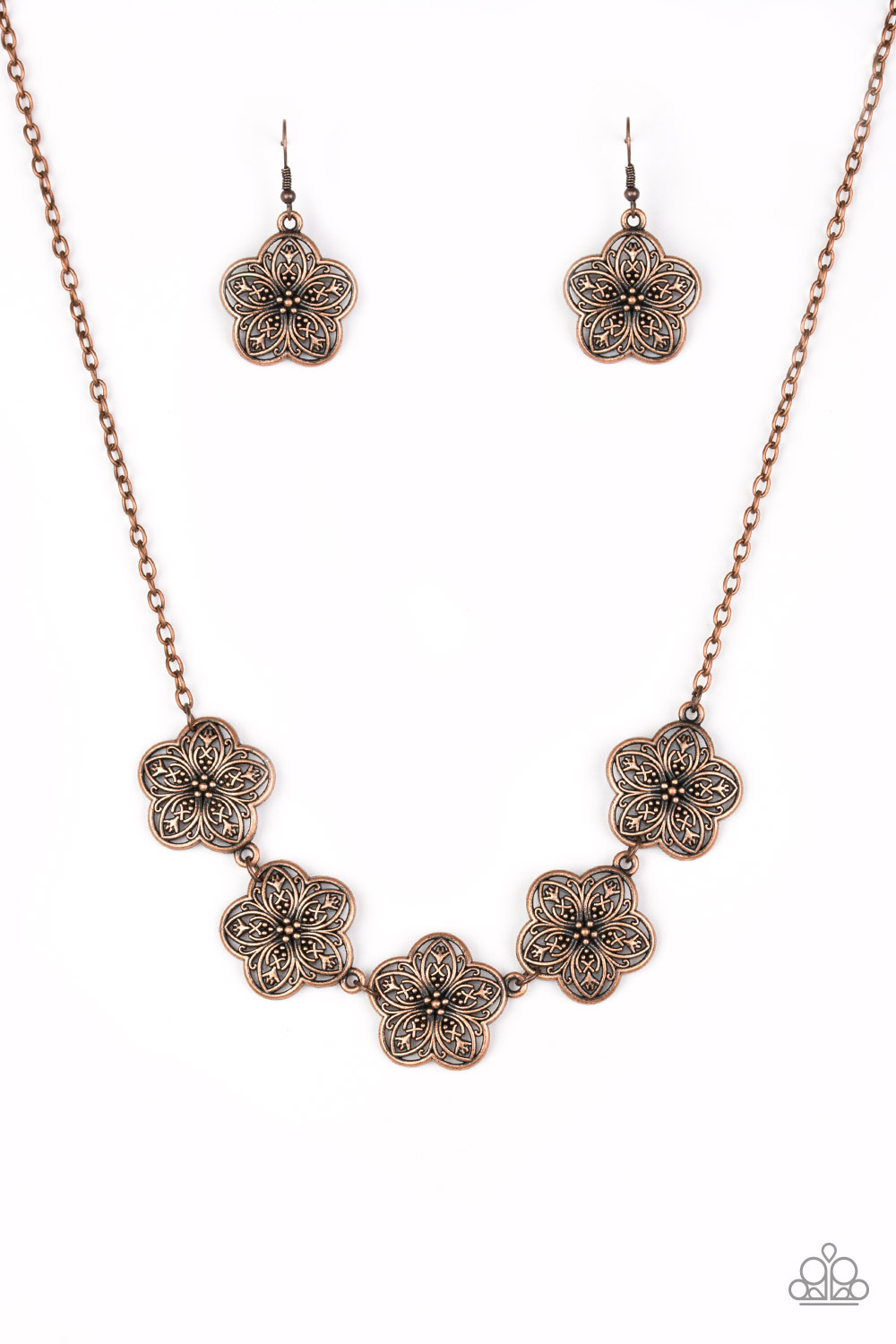 Ornate copper flowers connect below the collar for a simply seasonal look. Features an adjustable clasp closure.