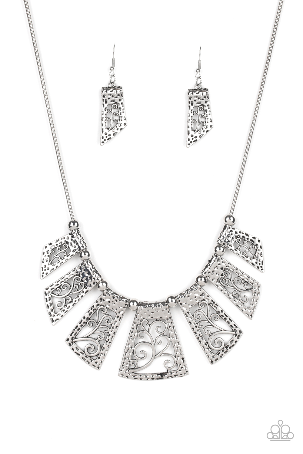 Infused with antiqued silver beads, a collection of hammered silver frames filled with vine-like filigree slide along a sleek silver chain below the collar for a statement-making finish. Features an adjustable clasp closure.