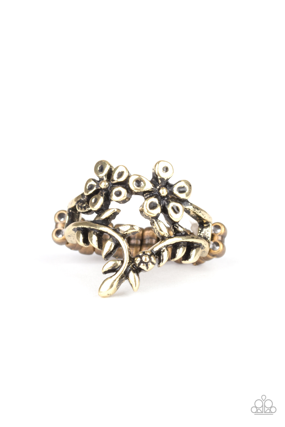 Leafy and flowery brass frames delicately bloom across the finger, stacking in a whimsically layered band. Features a dainty stretchy band for a flexible fit.