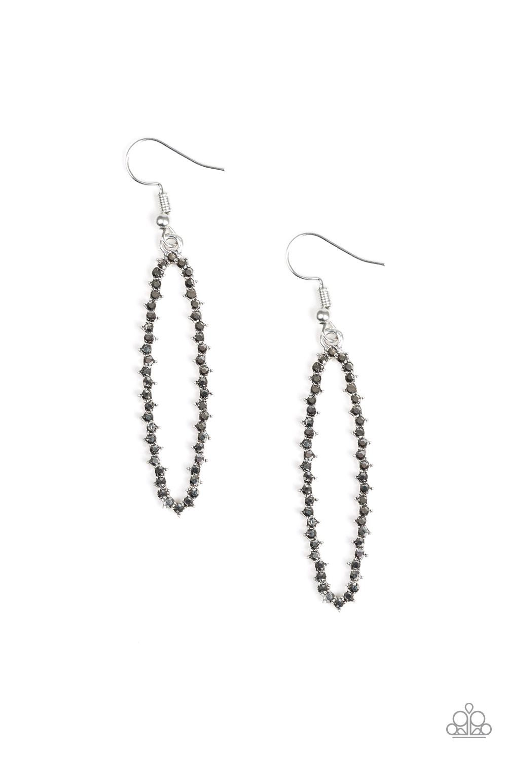 Dainty hematite rhinestones are pressed into a studded oval frame for a timeless look. Earring attaches to a standard fishhook fitting.