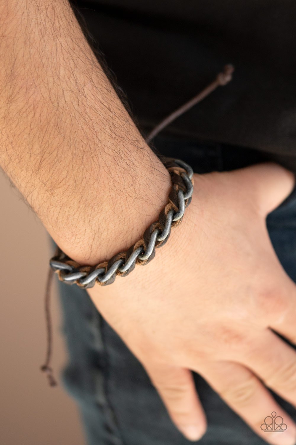 Rustic strips of brown leather weave through the center of an antiqued silver chain for a gritty look. Features an adjustable sliding knot closure.