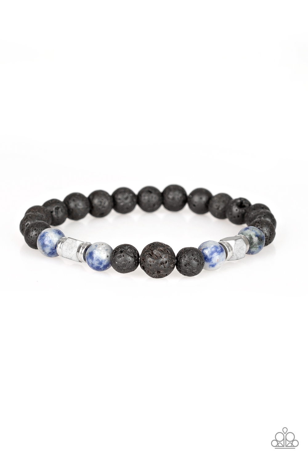 Infused with dainty silver accents, a collection of faceted cube beads, refreshing blue stone beads, and earthy lava rock beads are threaded along a stretchy band around the wrist for a seasonal look.