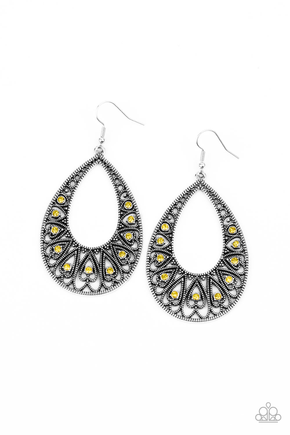 Dotted with dainty yellow rhinestone centers, studded silver heart frames fan out into a shiny silver teardrop frame for a lovable look. Earring attaches to a standard fishhook fitting.