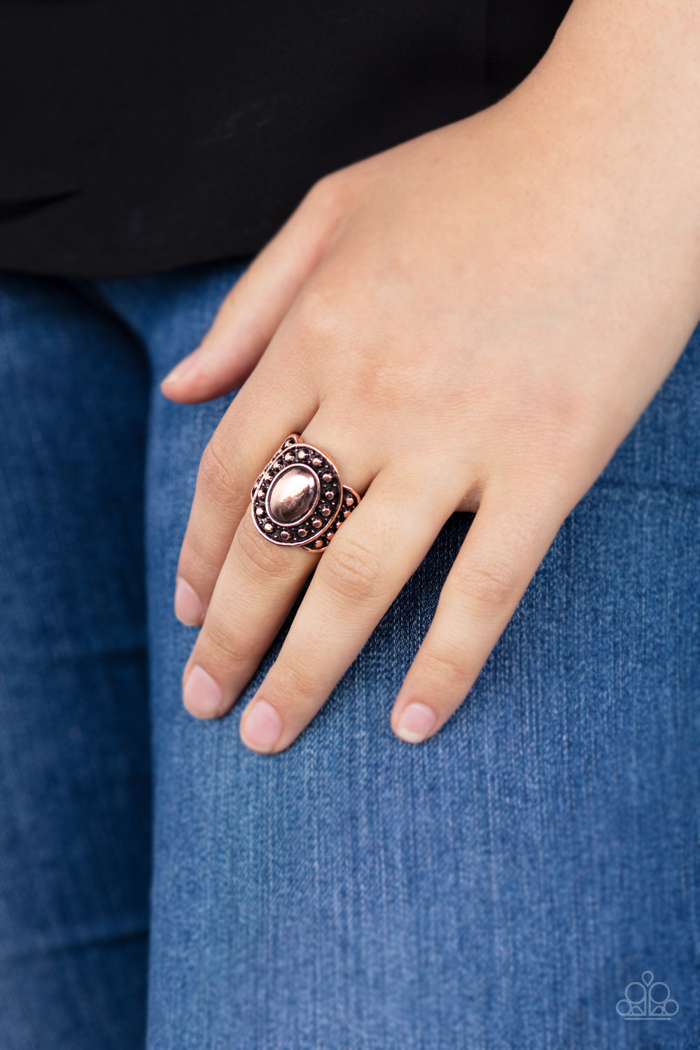 Dotted with a copper beaded center, antiqued studded copper frames stack into a rustic centerpiece that curves around the finger. Features a stretchy band for a flexible fit.