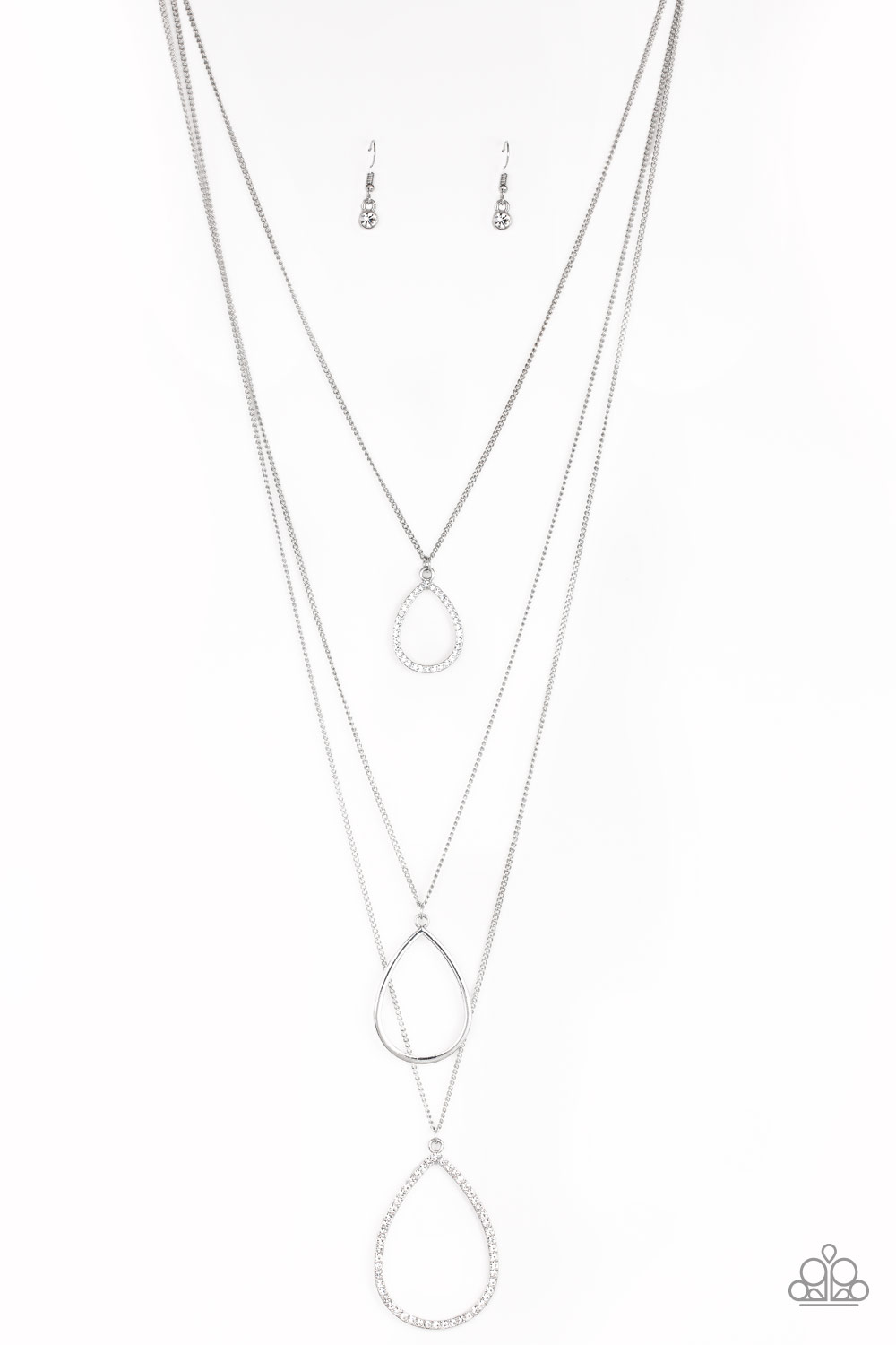A silver teardrop swings between two white rhinestone encrusted teardrop frames, creating refined layers down the chest. Features an adjustable clasp closure.